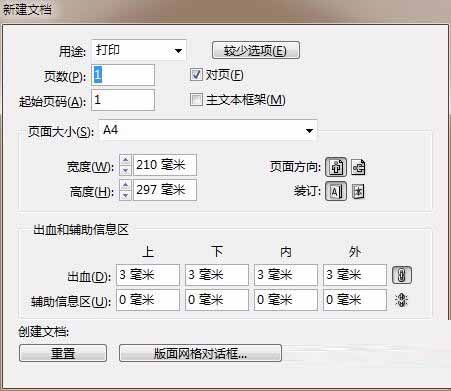 2、已A4单页为例,设置出血各3mm。还没有完,还要设置边距和分栏。点击进入设置框。