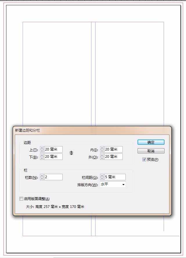3、设置边距和分栏的时候,已经可以看到将要设置好的样子。这里设置了边距各20mm,也就是最里面的大方框。栏数设置了2,栏距设置5mm。在后面的板式中都可以立马看到。设置参数根据设计而定。确认完成新建文档。