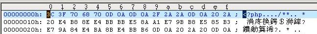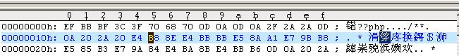 我们用ultraEdit打开这个文件,切换到16进制,可以看到,在文本的开头,有EFBBBF,之后才是3C 3F 70 68 70 ( <?php ),说明,在<?php之前,确实存在着输出信息,因此,在修改header的时候,会得到警告信息。