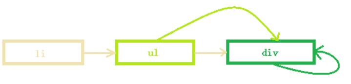 假设我们有三个对象:li、ul、div,三者关系图如下: