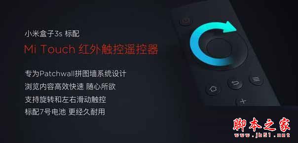 小米盒子3s标配了专为PatchWall拼图墙系统设计的Mi Touch红外触控遥控器。轻轻一转触控键就可快速翻阅内容,左右滑动触控键,还可以实现像手机触摸屏一样的迅速滑动。流畅精准、高效快速、随心所欲的操控体验尽在Mi Touch红外触控遥控器。