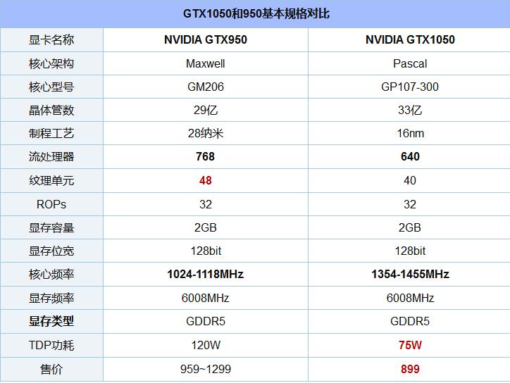 首先,我们先来了解一下GTX1050和950对比基本参数情况,初步了解一下这两款芯片之间的差异性。