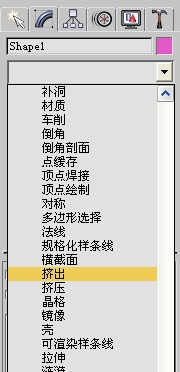 或者,选择后,在【修改】面板,点击【修改器列表】下拉菜单,选择【挤出】命令。