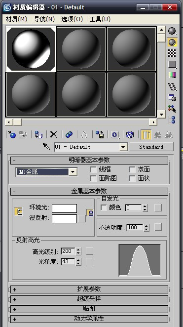 7.打开【材质编辑器】,【明暗器基本参数】设为【金属】,【环境光】和【漫反射】设为白色,高光级别200,光泽度43