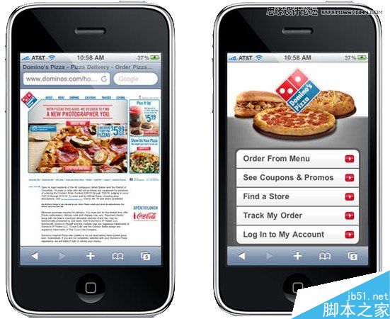 桌面端网页在移动端设备上首要的障碍就是导航的使用。看看下面Domino批萨的案例,它的桌面端和移动端网页的对比就相当明显,移动端页面经过优化之后的体验就完全不同。简单说来,优化后的移动端页面更加干净,有着更容易导航的CTA按钮