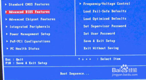 开机后按Del进入BIOS后是这个界面,点击第二项(Advanced BIOS Features)