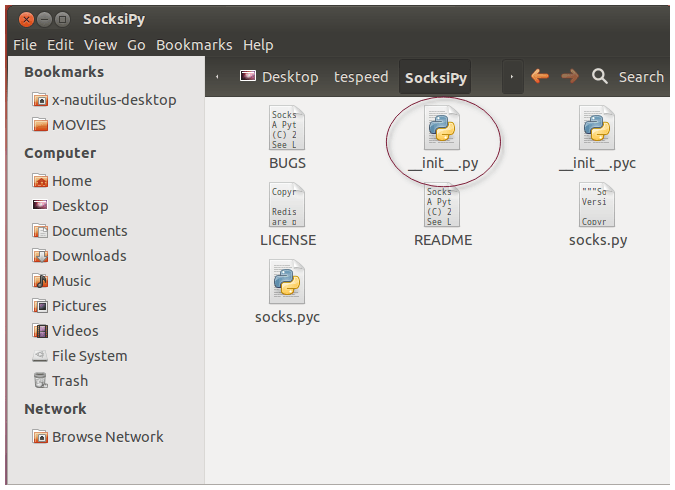接着把SocksiPy文件夹放到你克隆下来的tespeed项目中。现在我们要像截图那样在SocksiPy中的创建一个叫init.py的空文件。