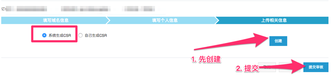 最后到上传信息这一步,一般选择系统生成 CSR。