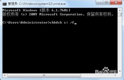 4、在命名提示符窗口输入:chkdsk c:/f 然后回车,然后会提示在下次启动时候检查C盘,然后输入Y并回车,然后会确认下次检查的结果