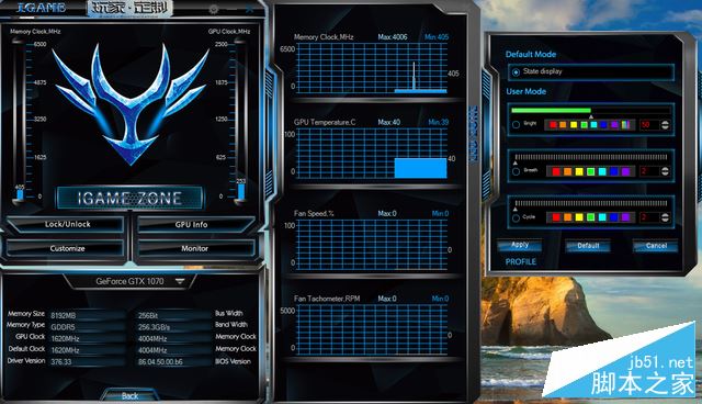 该软件的界面之中有一个大大的LOGO,整体采用冰蓝色的色调,看起来还是比较酷炫的。该软件的操作就像变形金刚一样,点击相关的功能的按钮,就能进入对应的功能。该软件包括显卡的温度及频率的监控、超频、灯光控制等等,功能还是比较全面的。如果想调节显卡的灯光颜色,需要点击Monitor。然后界面如下。