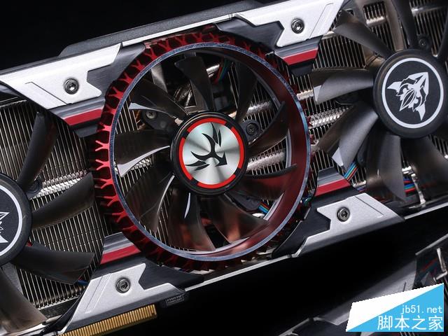 从正面看iGame1070 烈焰战神X-8GD5 Top AD显卡和之前的烈焰战神系列有些神似,其显卡外观沿用了烈焰战神系列的鲨鱼仿生学布局,显卡整体保持了一个流线型的布局。AD版在中间的风扇周围全是红色的镶边,同时配以树枝状的分支作为修饰,看起来非常的显眼。普通的烈焰战神显卡采用的是以黑色为基础配色,而最新的AD版采用银色配色为主。