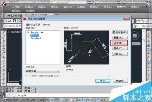 2、进入标注样式管理器后,这里可能会有很多样式,如果样式很多,可以在“样式”栏目下点击选择自己想修改的“样式”,如果想让他默认,就不用去选择。如果不想更改样式,只想新建一个样式来临时使用,可点击“新建”新建一个样式来进行更改,更改方式和下面一样。这里以默认的样式作为修改对象,因此点击“修改”。
