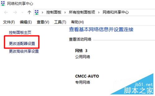 2、然后,在网络和共享中心设置中,在左侧菜单栏,找到“更改适配器设置”,单击打开它。