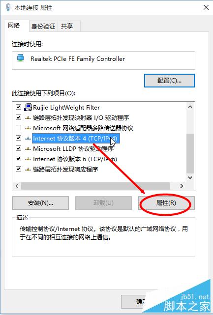 5、鼠标单击选中“internet协议版本4(TCP/IPV4)”,然后点击下方的属性设置