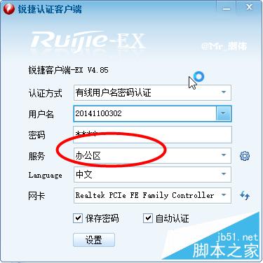 7、最后打开锐捷客户端,输入用户名和密码,在服务设置里这里要尤其注意,要将其设置为“办公区”,点击连接上网即可。