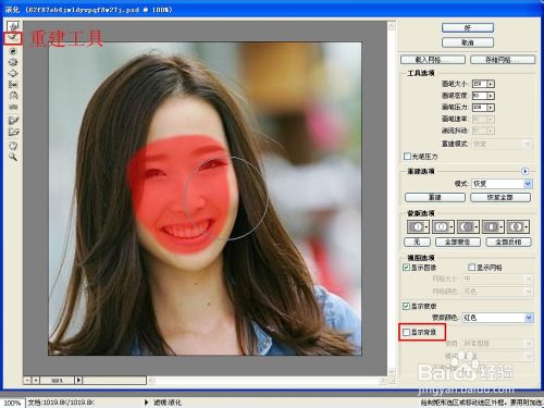 6、重新选择 向前液化工具(快捷键W)进行脸型液化,做坏了可以选择 重建工具(快捷键R)回复。也可以打开右侧的 显示背景 辅助调节,一般不需要。