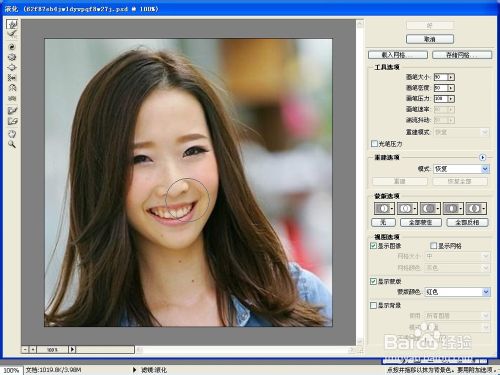 4、选择 向前变形工具(快捷键w) 右侧强度数值可以根据你的需要进行调整,一般选择默认!画笔大小可以用快捷键是中括号【 和 】调整。一般建议调脸型时尽量画笔大一些。