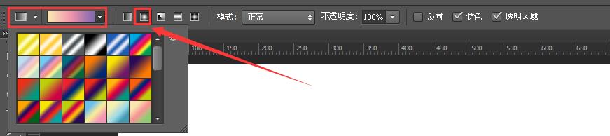 3、选择“渐变工具”,设置渐变颜色,以及在属性栏中选择第二个图标,及“径向渐变”;