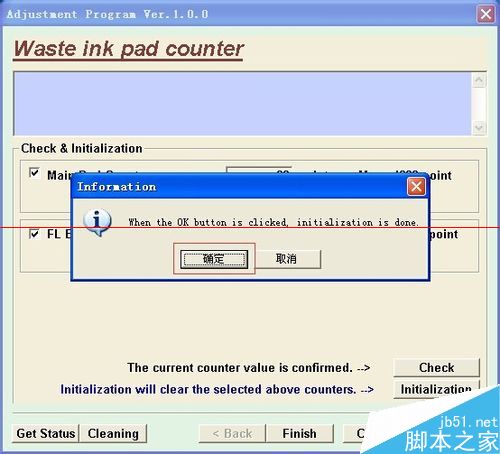4、如下图,勾选图内两个选项并点击“check”按钮清空打印机的数据,在弹出来的对话框内点击确定进入下一步。