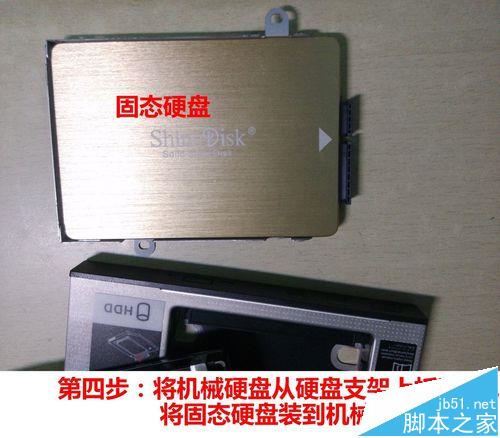 4、把机械硬盘从硬盘支架上拆下来,将固态硬盘固定到机械硬盘支架上。