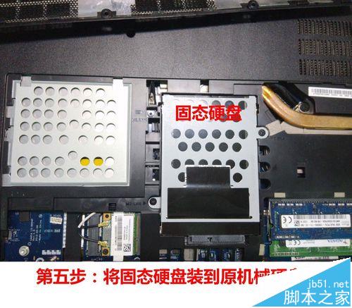 5、将安装到支架上的固态硬盘硬盘安装到原机械硬盘的位置,固定螺丝。