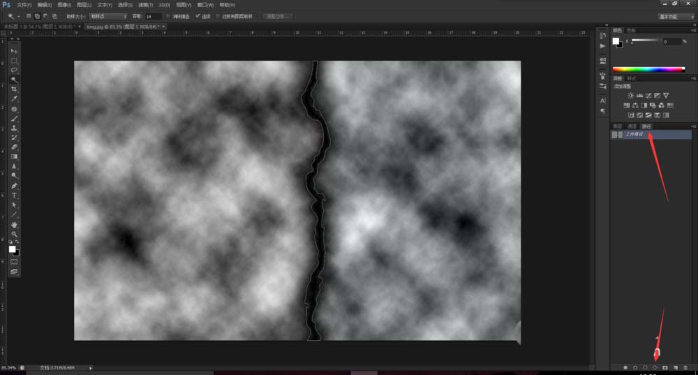 8、完成主干部分后,接下来制作分枝部分。重复2-4步骤,完成对中间黑色带选取后,点击“路径”转换到路径面板,点击“从选区生成工作路径”。我们用画笔描边路径的方法形成闪电。