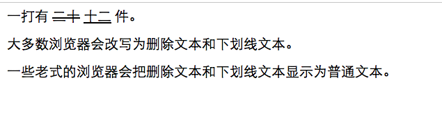 - <p>一些老式的浏览器会把删除文本和下划线文本显示为普通文本。</p>