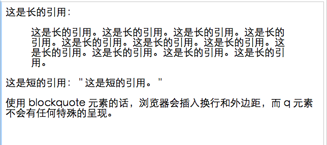 - 使用 blockquote 元素的话,浏览器会插入换行和外边距,而 q 元素不会有任何特殊的呈现。