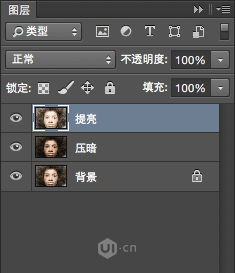 3.在"提亮"层上面新建两个图层,都填充黑色,上面的黑色层混合模式设置为叠加,下面的黑色层混合模式设置为颜色(这两个图层是便于观察脸部颜色的明暗)