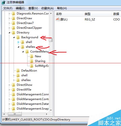 3、展开Directory,在其子目录中依次展开Background,shellex,ContextMenuHandlers