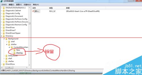4、在ContextMenuHandlers项目下,除了New和Sharing,其他选项都删除。关闭注册表,回到桌面试试你的菜单右键是不是快了很多。