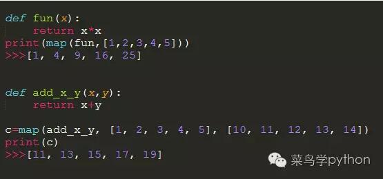 map可以根据提供的函数对指定序列做映射,它接受一个函数f和一个list,并通过把函数f以此作用在list上的每个元素,然后返回一个新的list,map函数的入参也可以是多个.注意这个函数一定要有返回值(值值值重要的说三遍)。