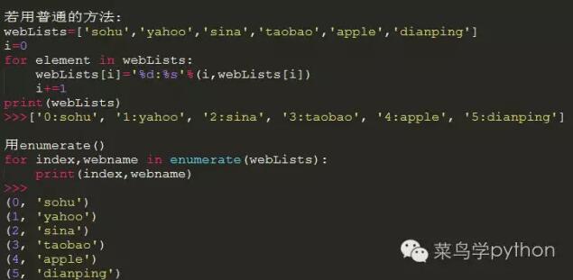 Python中,迭代永远是取出元素本身,而非元素的索引,有的时候我们需要知道元素的索引比如在一个很长的列表里面是一些网站名,我们希望在打印的时候,也能列出索引。若没有这个函数,我们需要在加一个变量,在循环打印的时候让这个计数变量递增,现在有了enumerate,就不用这么麻烦了,直接搞定.