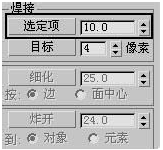 6、利用顶点级别的焊接选项组中的选定项按钮,将焊接范围加到10左右,如图7所示,对节点进行焊接。