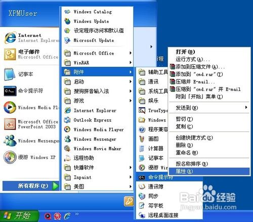1、单击“开始”,单击“所有程序”,单击“附件”,右击“命令提示符”,弹出的快捷菜单单击“属性”命令