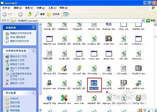 3、直接定位到“%SystemRoot%\system32\cmd.exe”,右击“cmd.exe”,打开的菜单单击“重命名”,将扩展名修改为“cmd”,按回车键