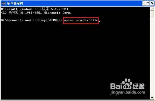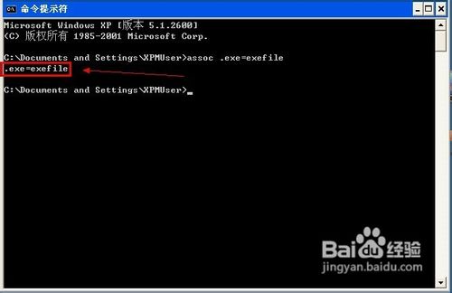 4、在命令提示符窗口键入“assoc .exe=exefile”或“ftype exefile="%1" %*”命令,然后按回车键
