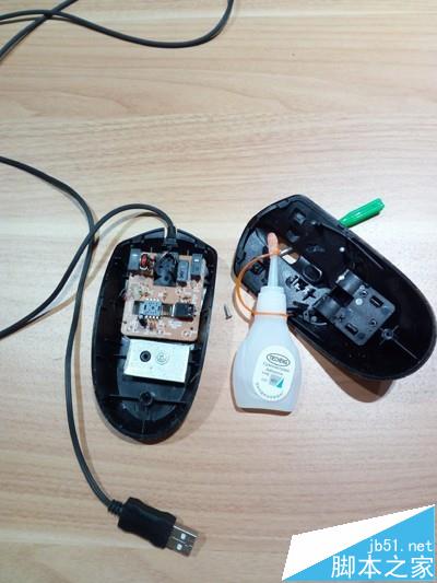 6、我们这时就需要用到101或者502胶水(也可以用其他胶水,但是必须粘性大的)将杠杆粘好,放置一段时间后合上鼠标外壳,插到电脑上试试,一般我们就会发现鼠标滚轮能用了,然后我们再将鼠标的螺丝上上去。(粘的时候注意不要让胶水把打码器粘死了,那样鼠标滚轮也就废了)