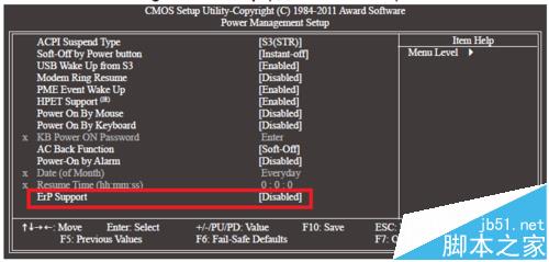 3、<ErP Support>的默认设置是<Disabled>,修改为<Enabled>。ErP Support选项提供您选择是否在系统关机(S5待机模式)时耗电量低于1瓦。(预设值:Disabled)