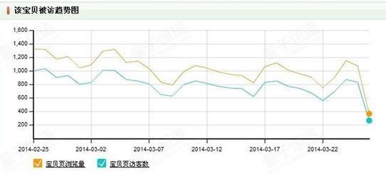 1丶观测宝贝一段时间内的流量变动情况,可以在量子恒道中的宝贝被访详情页中看到,能够一目了然看到宝贝每天的流量变动趋势。如果哪几天的流量下降较大,要及时查找原因来解决。