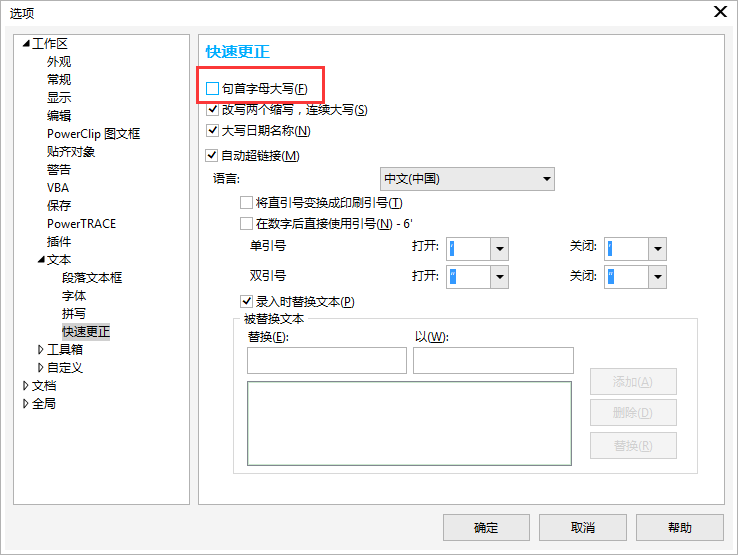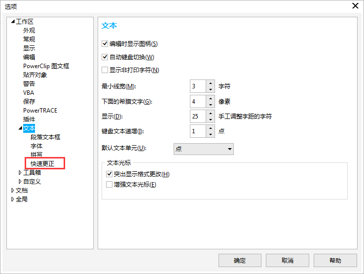 利用CorelDRAW中的快速更正能够将自动更正拼错的单词和大写错误。通过指定要自动更正的错误类型可以自定义"快速更正"。