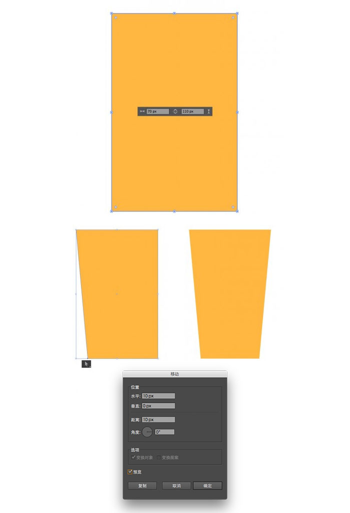现在我们来绘制一杯新鲜的果汁。选择矩形工具(M)并绘制一个 70x110px 的形状。使用直接选择工具(A)选择左下方的锚点,然后按 Enter 键打开“ 移动 ”窗口。将“ 水平 ”值设置为 10px,使点向右移动。对于相反的锚点执行相同操作,但此时将值设置为 -10px。这样可使杯子的底部变窄。