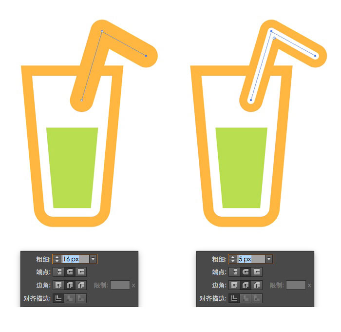 现在我们来绘制吸管。使用钢笔工具(P)绘制吸管,并将描边设置为 16px,具体设置如下哦。