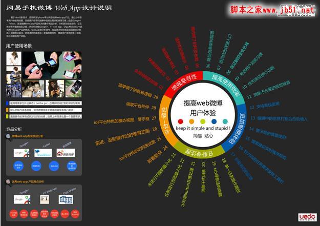 该产品具体的交互设计理念来源于:用户使用场景的调查、竞品分析、Web App研发现状、微博Web App的自身要求。最终归纳得出的交互设计理念主要有: