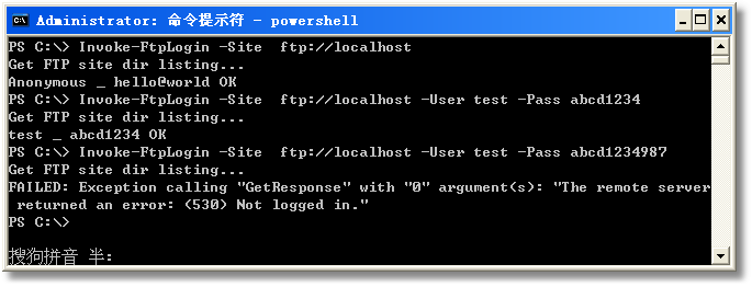 以上就是喜悦墨镜最近收集整理的关于PowerShell脚本开发之尝试登录ftp的全部内容,更多相关PowerShell脚本开发之尝试登录ftp内容请搜索靠谱客的其他文章。