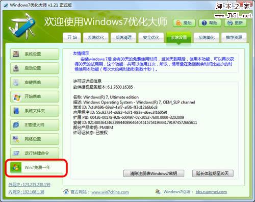 好的,如果这些原版系统上述方法还不能激活,去用OEM 原版吧,刷刷bios,安装对应电脑品牌的OEM纯净原版系统,无需破解。实在是组装机没有办法激活Win7,还有Windows7优化大师,系统设置里面有免费试用正版Windows7一年的功能(原理是通过修改注册表延长试用期),办法很多。