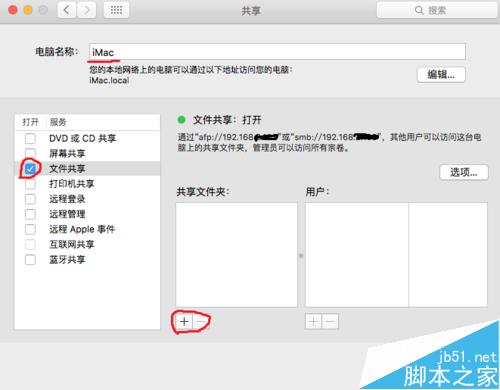 4、在共享设置中打开文件共享功能,然后点击右侧红圈位置的+号,添加要共享的文件夹。