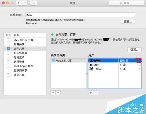 5、可以给每个添加到共享的文件夹指定可以访问的账号和读写方式。"可以访问的账号"指的是在Mac电脑中创建的用户账户。