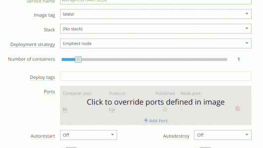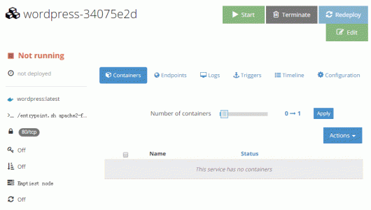 1、选择Wordpress镜像后,点击部署。你可以设置Service name、Image tag、Stack等等。