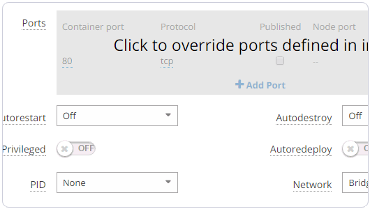 2、Ports中可以自己设置端口,默认的tcp的80端口是开启的,还有你可以选择是否开启自动重启、自动部署应用等等。
